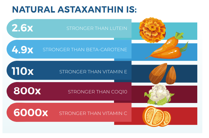 • It is one of nature’s most powerful antioxidants, which means it is very good at quenching free radicals. One study revealed that astaxanthin is 6,000 times stronger than vitamin C, 110 times stronger than vitamin E, and even three to five times stronger than its cousin carotenoids, lutein and beta carotene.