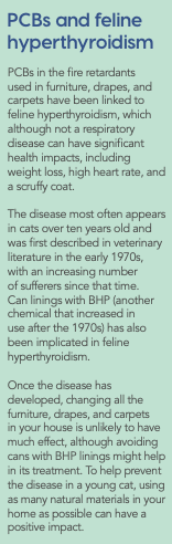 The number of environmental toxins present in our homes has increased steadily since the 1970s. From fire retardants to air fresheners, these chemicals were all originally created to makes our lives easier, safer, or more pleasant. But for some individuals, including our feline companions, they can make life more difficult. Exposure to the chemicals used in fabrics and materials for curtains, rugs, furniture and other household items has resulted in a variety of health problems in both humans and animals. The greater the number, variety, and concentration of manmade chemicals in a household, the greater the chances that your cat (or human family) will suffer from the health effects they can produce.